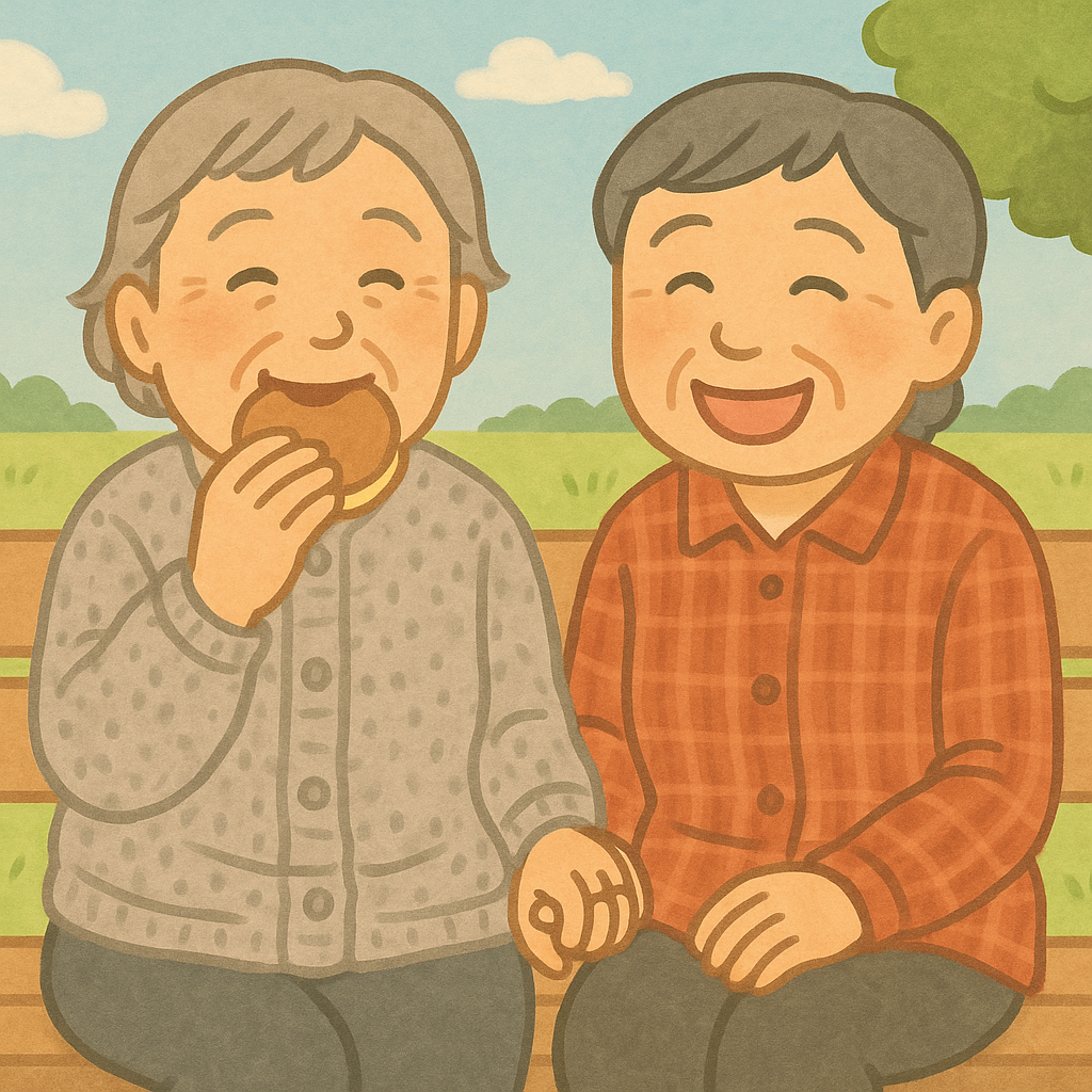 晴れた清々しい日に公園のベンチで、どら焼きを食べて笑う母の姿。