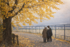 きれいに色づいたイチョウの木の下に立つ母の姿でした。
